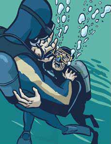 你在水中听到你的潜伴发出求救的声音,当你注意到的时候,你的潜伴已经因为过度换气导致气源耗尽,并且因为慌张将调节器从口中吐出。是的,眼前的这位慌张失控的潜水员是你最要好的潜伴,同时也是可能让你赔上性命的人,这种危险的杀伤力,一般来说比装备故障更大上十倍。现在,你该怎么办?