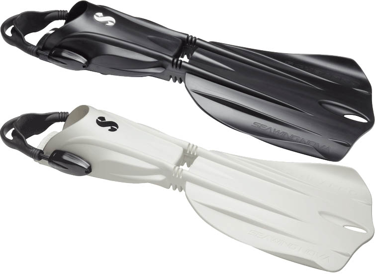 分叉式脚蹼虽好但无论哪家公司生产都必须缴纳专利费,因此价格要比片式脚蹼高很多。近年来在分叉式脚蹼的刺激下各家公司不断加大脚蹼的研发力度,推出不少有创意的新式脚蹼。但从整体情况看这些新脚蹼的上下踢动效果还没有能超过分叉式脚蹼的。在诸多新式脚蹼中,最为成功的设计当属 SCUBAPRO 的这款 Seawing Nova 脚蹼。