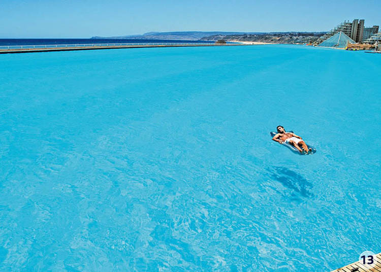 这是智利的San Alfonso Mar度假酒店的游泳池,它长1013米,最深的地方有35米,一共装了约25万立方米的水!是世界上最大的室外游泳池!相当于20个奥运会规模游泳池大小!